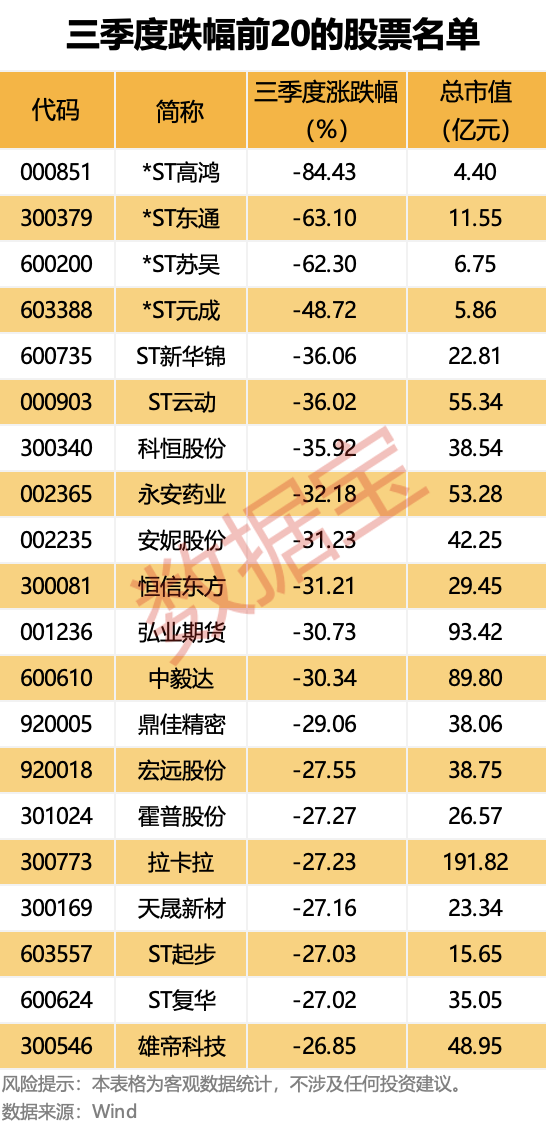 跌幅最大的*ST 高鸿因股票收盘价格已连续二十个交易日均低于 1 元,触及交易类强制退市情形。该股三季度下跌 84.43%。此外,跌幅排在第三的 ST 苏吴 9 月 30 日收盘价为 0.95 元/股,亦发布风险提示公告。