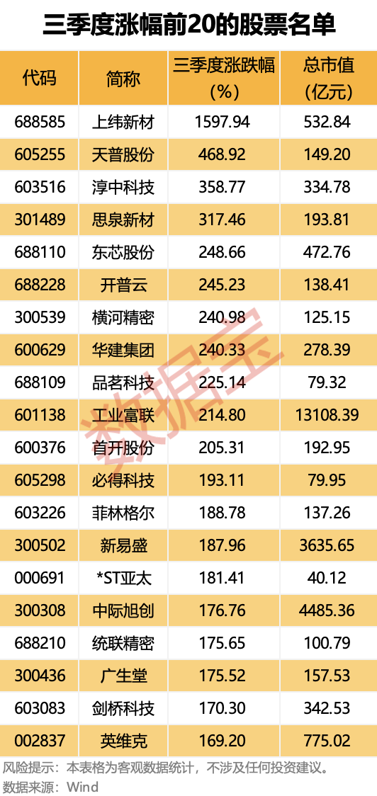 据证券时报·数据宝统计,剔除今年上市的次新股,共有 93 股三季度涨幅超过 100%,上纬新材以 1597.94% 的涨幅居于榜首,天普股份、淳中科技、思泉新材紧随其后,分别上涨 468.92%、358.77%、317.46%。
