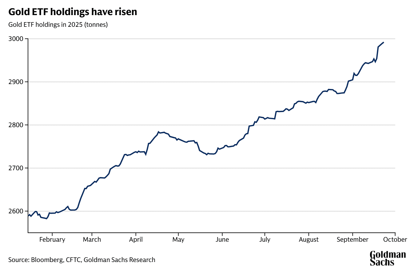 高盛研究部分析师莉娜·托马斯 (Lina Thomas) 在团队报告中写道,预计到明年年中,金价将升至每盎司 4000 美元。这一预测主要受两大因素驱动:各国央行强劲的结构性需求,以及美联储的宽松政策 (这将提振黄金 ETF 的需求)。