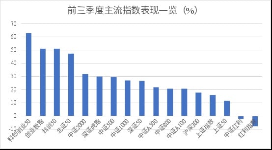 具体来看,主流指数前三季度总体上演上涨行情,其中科创创业 50 年内涨幅达到 63.04%,表现最好;创业板指、科创 50、北证 50、中证 2000 等指数表现强势,涨幅超 30%,仅红利指数、中证红利出现下跌。