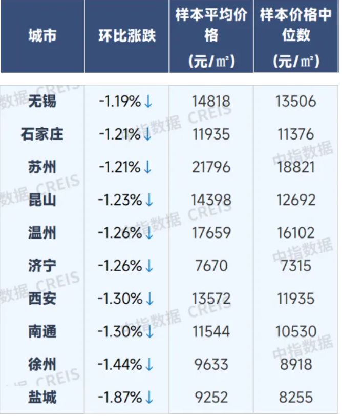 在二手住宅价格环比下跌的城市中,盐城 (-1.87%)、徐州 (-1.44%)、南通 (-1.30%)、西安 (-1.30%)、济宁 (-1.26%) 等城市环比跌幅靠前。