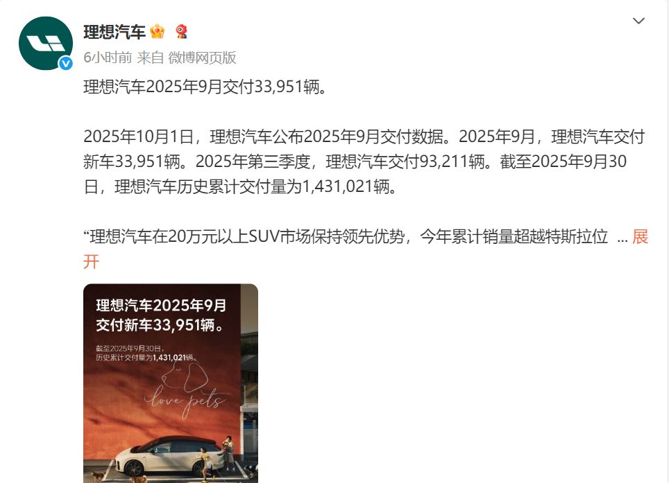 理想汽车公布 9 月交付数据。2025 年 9 月,理想汽车交付新车 33,951 辆。2025 年第三季度,理想汽车交付 93,211 辆。截至 2025 年 9 月 30 日,理想汽车历史累计交付量为 1,431,021 辆。