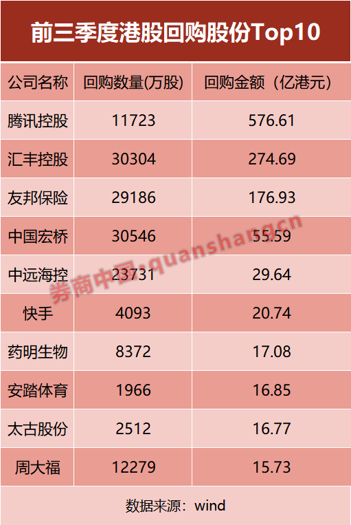 前三季度港股回购数据出炉。