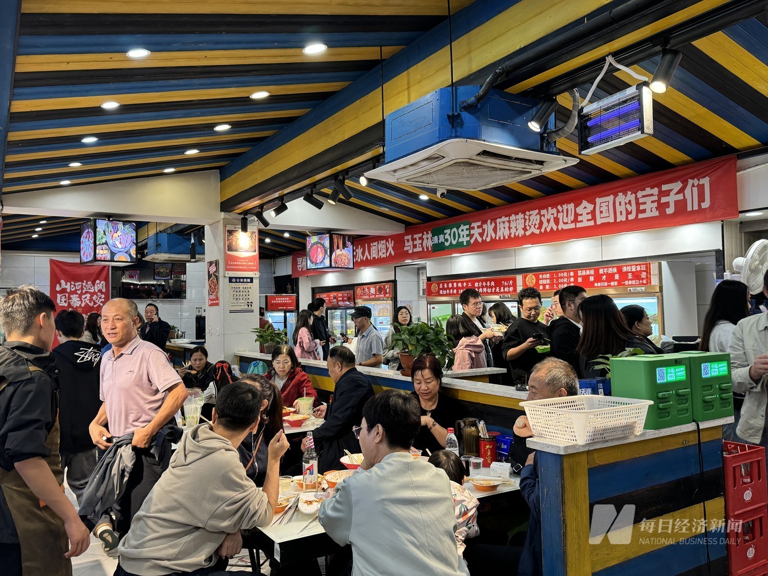 下午两点,《每日经济新闻》 记者在现场看到,虽然已过饭点,但前来 「打卡」 哈海英麻辣烫的游客依旧络绎不绝,队伍不断拉长。这股热度也蔓延至隔壁的 「开元麻辣烫」 和 「伊甸园麻辣烫」,门前同样排起长队;对面的手擀粉店与饮品店也生意火爆。