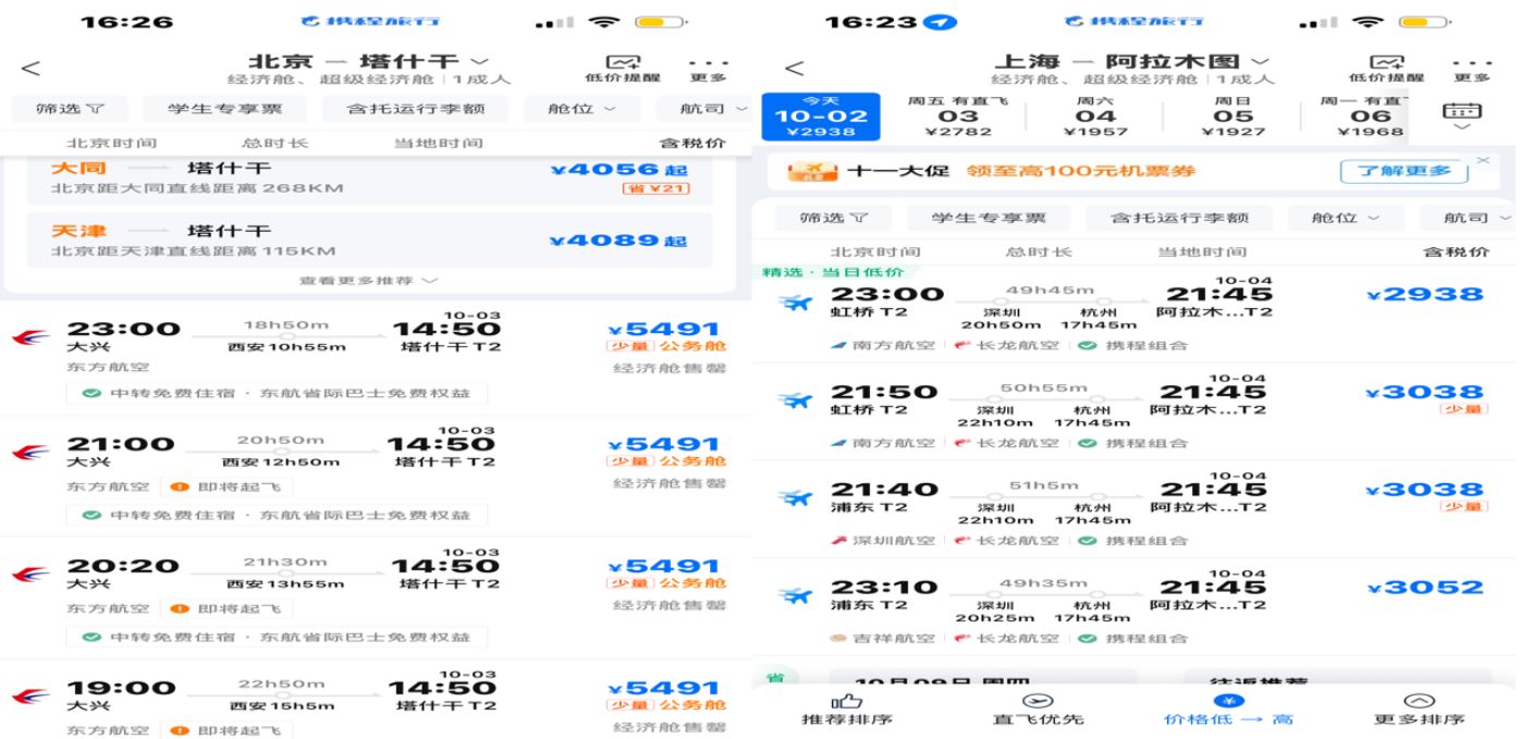10 月 3 日上海、北京至哈萨克斯坦、乌兹别克斯坦的最低机票价格仍超过 2000 元