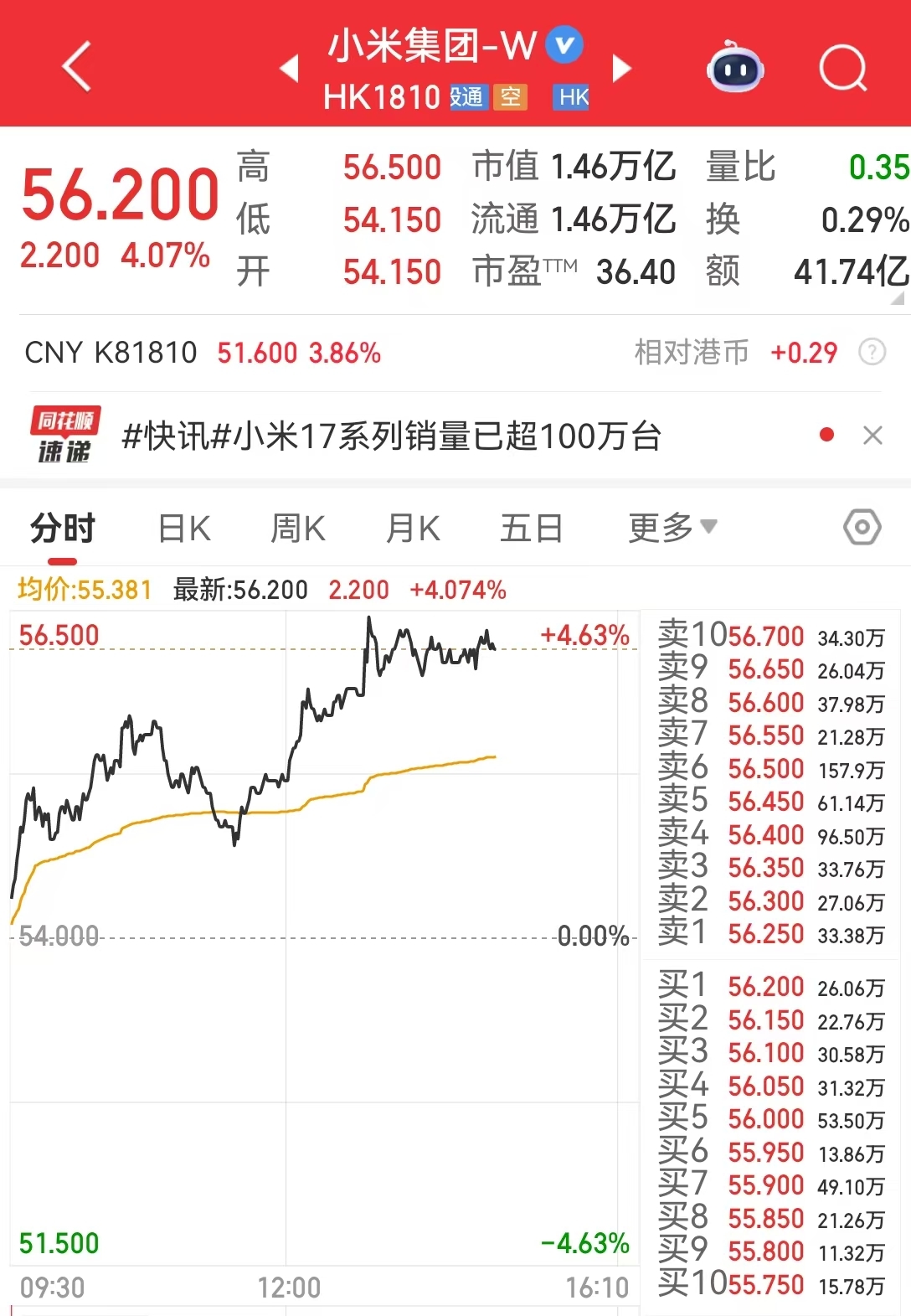 10 月 2 日,小米集团手机部总裁卢伟冰称小米 17 系列销量已超 100 万台,小米正抓紧提高生产。9 月 25 日,雷军发布该系列新机,9 月 27 日 10 点全渠道开售,5 分钟就刷新 2025 年国产手机全价位段新机系列首销全天销量、销额纪录。截至 10 月 2 日发稿,小米集团涨幅为 4.07%。