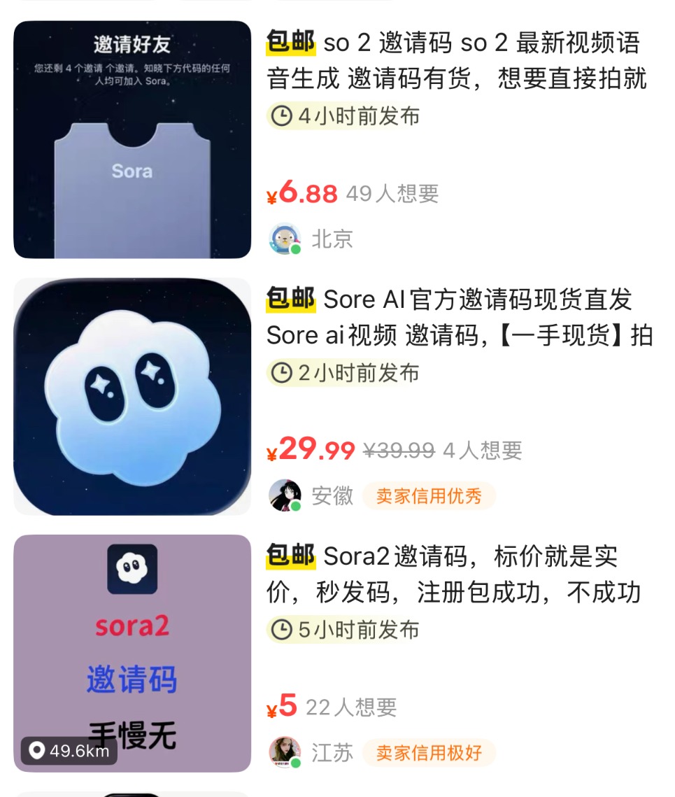 由于 Sora 采用邀请制免费使用,在国内,闲鱼上已经出现 29.9 元买邀请码的生意,不过单价 6.88 元的邀请码更受欢迎,界面显示已经有近 50 人想要。