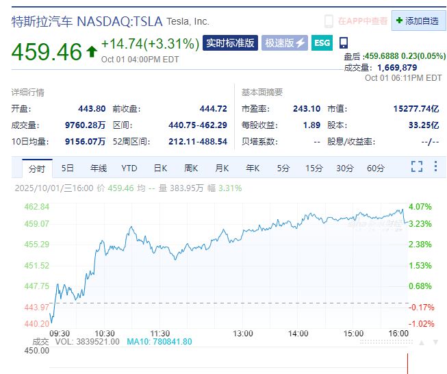 特斯拉报 459.46 美元,涨 3.31%,最新市值 1.53 万亿美元,其市值一夜增加 490 亿美元(约合人民币 3489 亿元)。