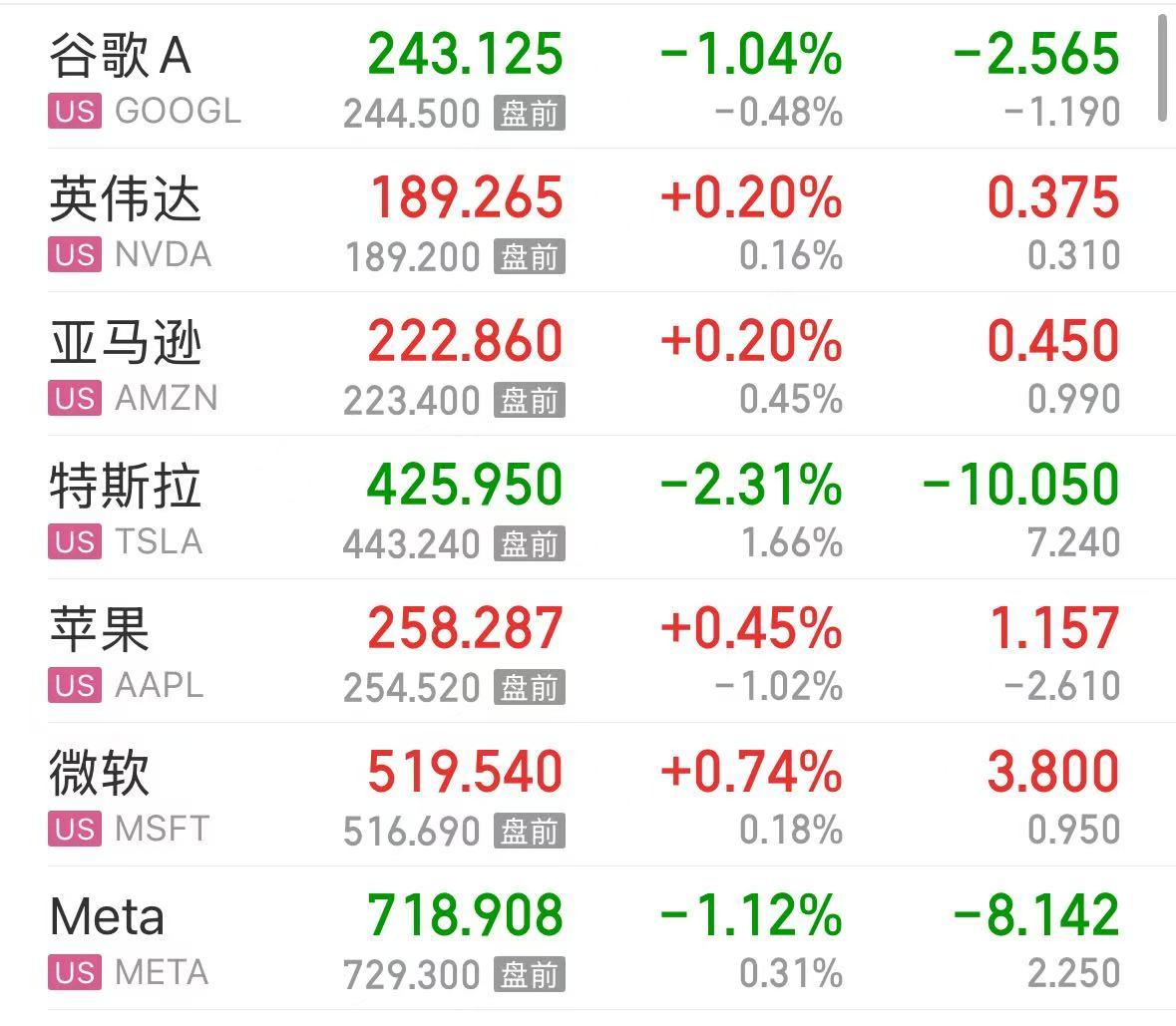 大型科技股涨跌不一,特斯拉跌超 2%,谷歌、Meta、英伟达、亚马逊、苹果、微软上涨。