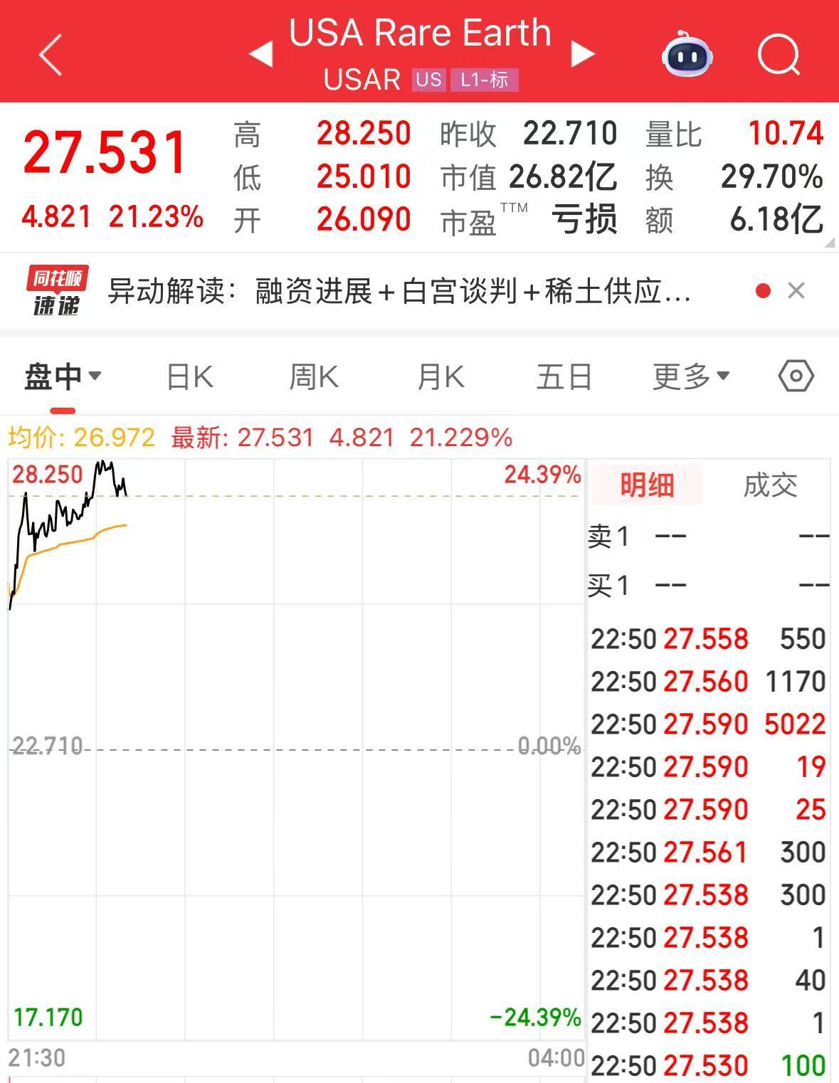 美股稀土概念股全线爆发,USA Rare Earth 公司股价涨超 21%。消息面上,该公司首席执行官 Barbara Humpton 确认公司正与美国白宫进行讨论。