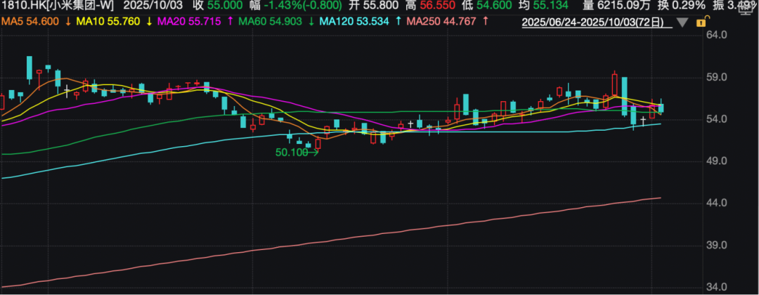 10 月 3 日,港股整体走势疲软,小米集团股价收跌 1.43%,报 55 港元/股,最新市值 14315 亿港元。