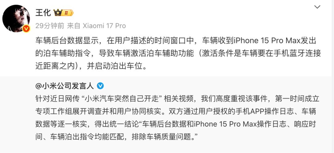 当天晚间,小米集团公关部总经理王化也转发相关微博,并强调:「车辆后台数据显示,在用户描述的时间窗口中,车辆收到 iPhone 15 Pro Max 发出的泊车辅助指令,导致车辆激活泊车辅助功能 (激活条件是车辆要在手机蓝牙连接近距离之内),并启动泊出车位。」