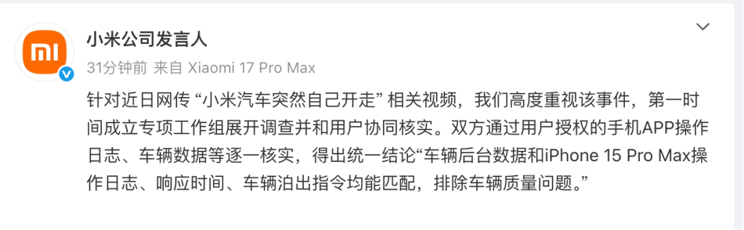 10 月 3 日晚间,针对近日网传 「小米汽车突然自己开走」 相关视频,小米公司发言人回应称,公司高度重视该事件,第一时间成立专项工作组展开调查并和用户协同核实。双方通过用户授权的手机 APP 操作日志、车辆数据等逐一核实,得出统一结论 「车辆后台数据和 iPhone 15 Pro Max 操作日志、响应时间、车辆泊出指令均能匹配,排除车辆质量问题」。