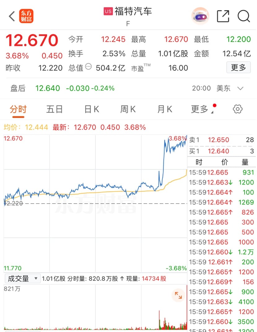 受上述消息刺激,汽车制造商股价在美股尾盘集体拉升,截至收盘,福特汽车大涨 3.68%,克莱斯勒母公司 Stellantis 大涨 3.17%,通用汽车涨 1.3%。