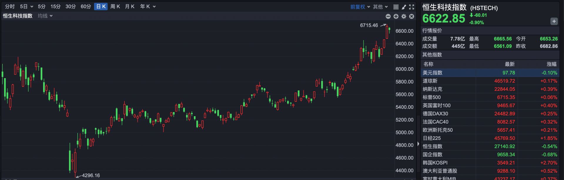 恒生科技指数报收于 6622.85 点,下跌 60.01 点,跌幅 0.90%。