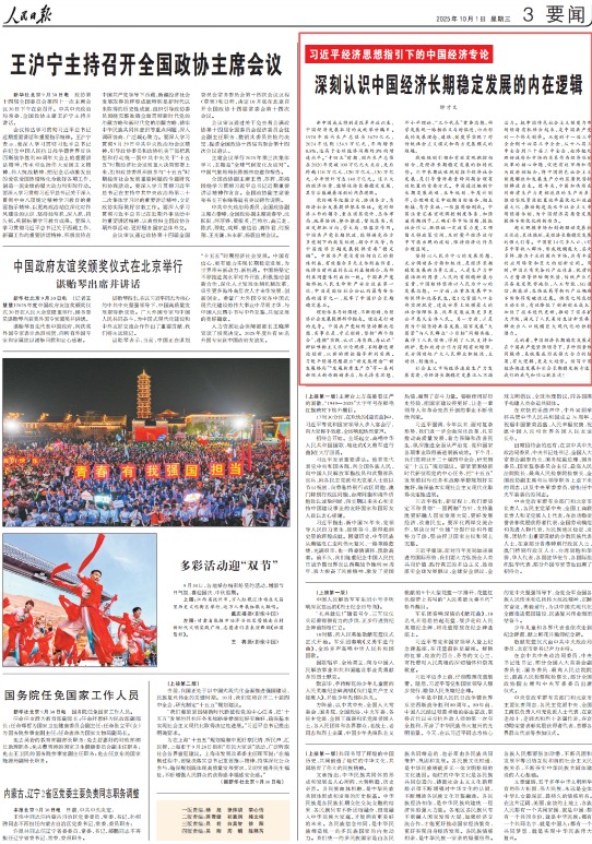 10 月 1 日,「钟才文」 评论 《深刻认识中国经济长期稳定发展的内在逻辑》 系统总结了支撑中国经济行稳致远的六大要素:坚持党的领导;理论体系与时俱进、不断创新;战略规划引领和有效宏观调控相结合;坚持以人民为中心的发展思想、充分调动各方面积极性;社会主义市场经济适应生产力发展需要;超大规模市场和创新驱动发展相互促进、良性循环。
