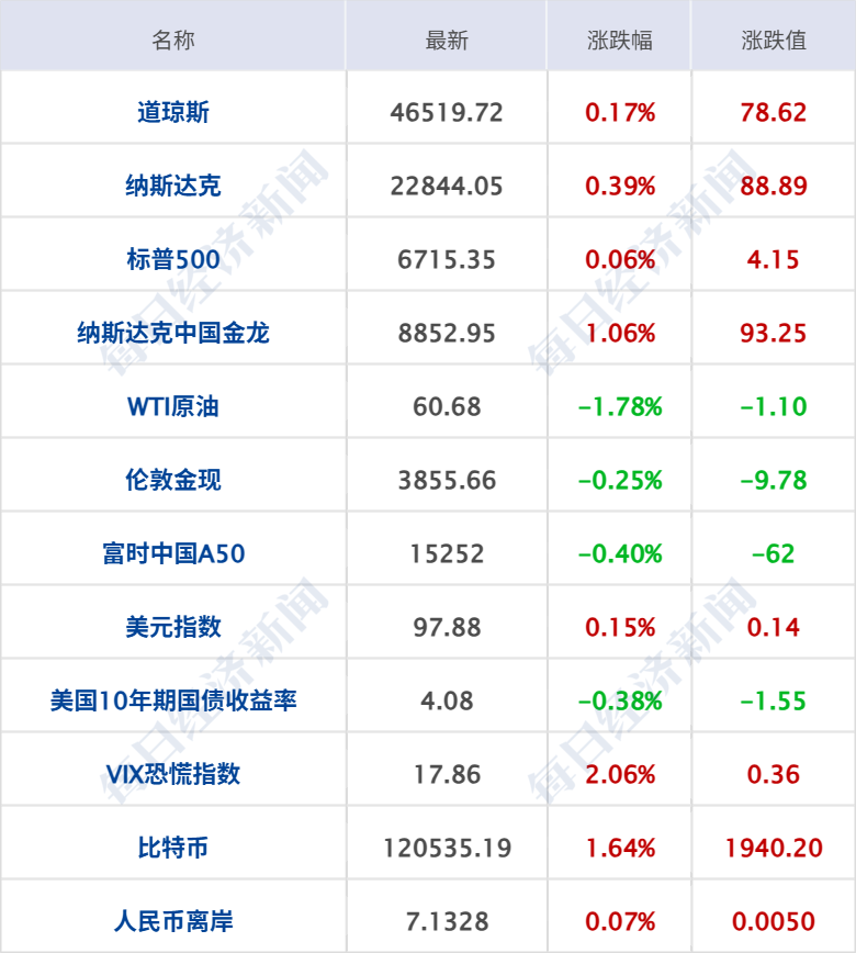 美股三大指数集体收涨,道指涨 0.17%,纳指涨 0.39%,标普 500 指数涨 0.06%,大型科技股涨跌不一,Meta、博通涨超 1%,特斯拉跌超 5%。加密货币、半导体设备涨幅居前,Circle 涨超 16%,Coinbase 涨超 7%,康特科技涨超 3%,阿斯麦涨超 2%。纳斯达克中国金龙指数涨 1.06%,中概股多数上涨,世纪互联涨超 4%,阿里巴巴、蔚来、金山云涨超 3%,百度涨超 2%,哔哩哔哩、理想汽车涨超 1%;名创优品跌超 3%。