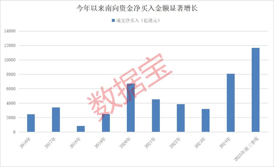 据证券时报·数据宝统计,第三季度南向资金合计成交净流入 4363.22 亿港元,年内已累计净买入 11675.15 亿港元,超过 2023 年与 2024 年净买入金额之和。