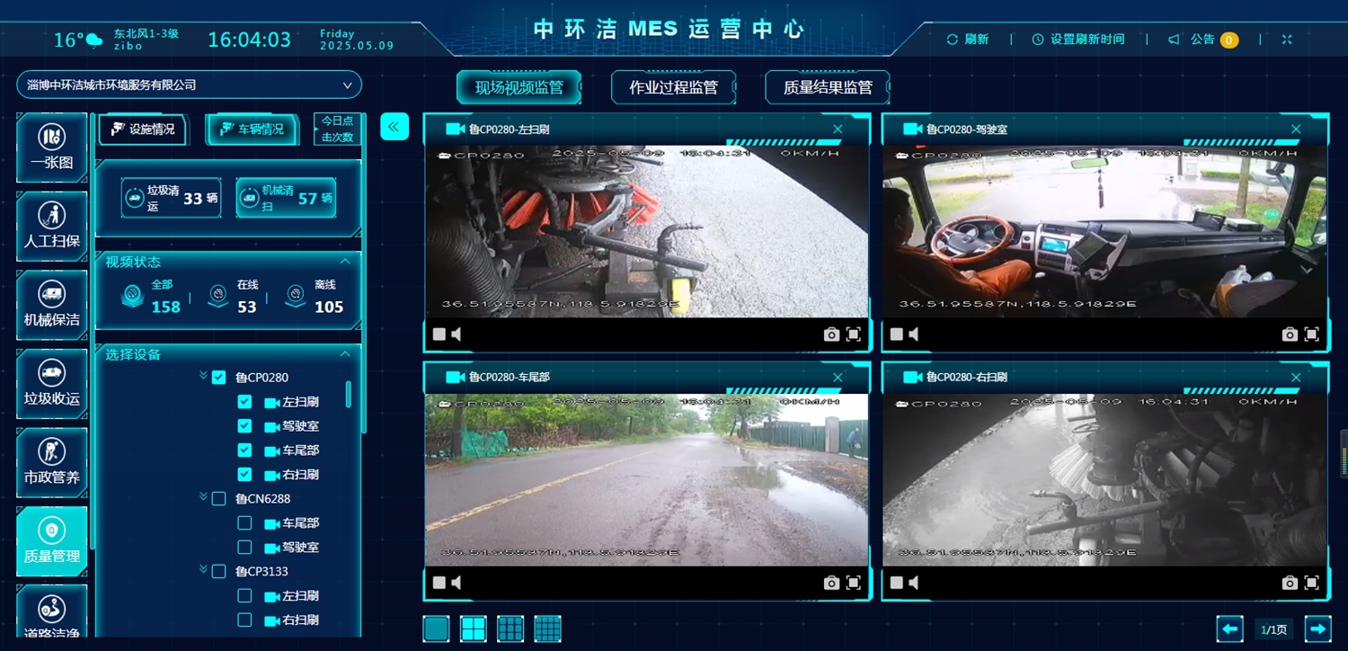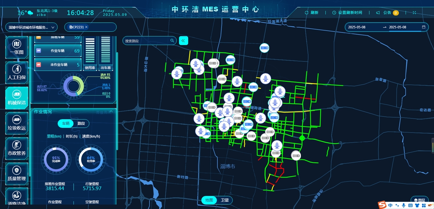 几乎在同一时间,这些数据被实时回传到智慧环卫 MES 管理平台的调度中心——城市保洁真正的 「智慧大脑」。在大屏幕上,我看到我们刚刚经过的路段被标记为异常。
