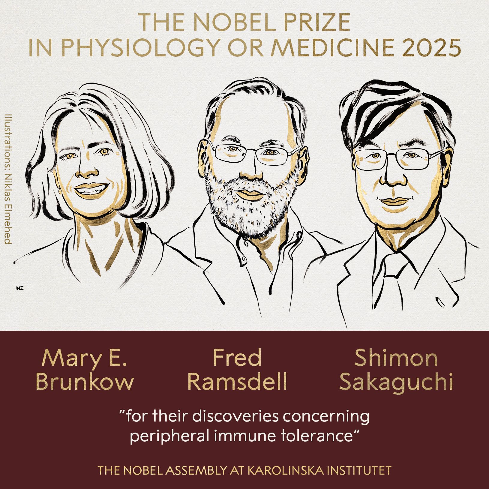 据央视新闻,当地时间 10 月 6 日,瑞典卡罗琳医学院宣布,将 2025 年诺贝尔生理学或医学奖授予科学家玛丽·E·布伦科 (Mary E. Brunkow)、弗雷德·拉姆斯德尔 (Fred Ramsdell) 和坂口志文 (Shimon Sakaguchi),表彰他们在外周免疫耐受方面的研究贡献。