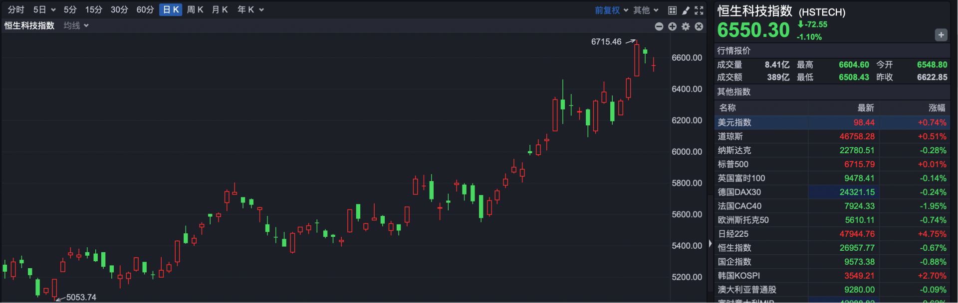 恒生科技指数报收于 6550.03 点,下跌 72.55 点,跌幅 1.10%。