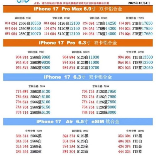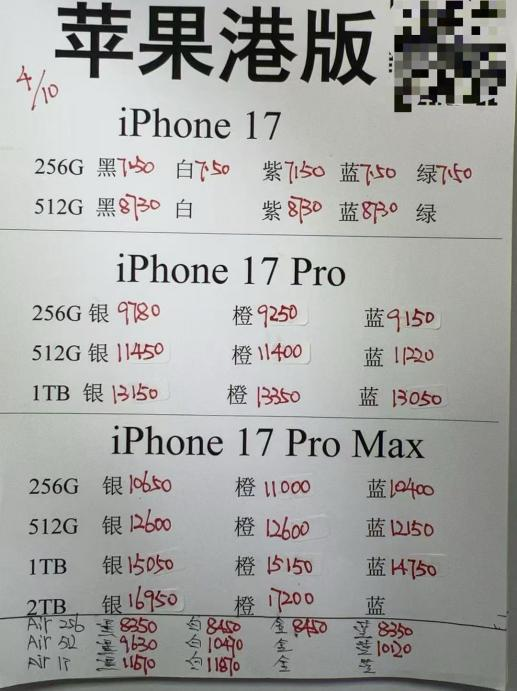 在远望数码商城,销售员老陈向蓝鲸科技记者出示的报价单显示,512GB 版 iPhone 17 报价为 7950 元,同容量 iPhone 17 Pro 为 10700 元,而顶配 2TB 版 iPhone 17 Pro Max 价格高达 17650 元。尽管部分热门机型仍存在 30 至 450 元不等的溢价,但相比 9 月 19 日首发时全线溢价 400–1300 元的局面已明显回落。