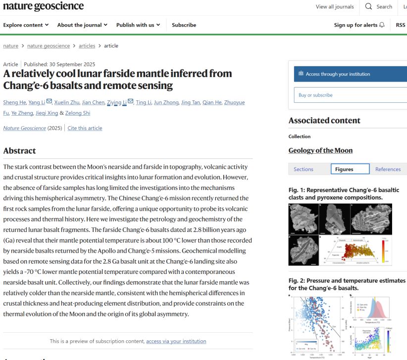 10 月 6 日,国家航天局等联合发布嫦娥六号月球背面样品研究新成果:中国科学家首次发现月球背面月幔比正面更 「冷」,深化了对月球 「二分性」 的认识。该研究由中核集团等合作完成,已刊发于国际期刊。另据 10 月 1 日消息,嫦娥六号就位光谱探测取得突破,揭示了月球水分布特征,为月球水的形成机制与未来利用提供依据。