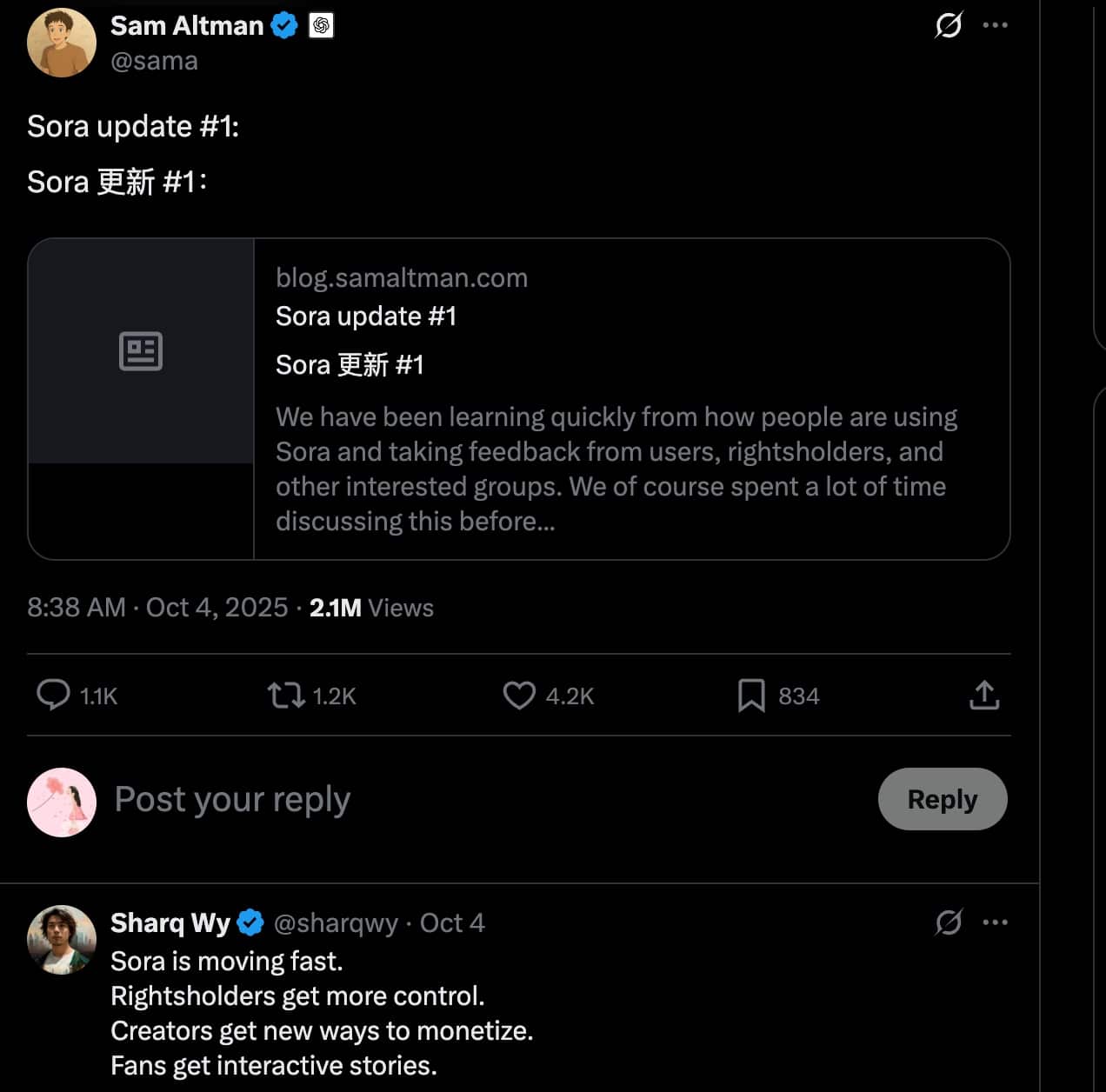OpenAI CEO 萨姆·奥特曼在推文中宣布:Sora 将全面调整版权政策,未来将引入 「IP 分成」 收益机制——只有版权方明确授权的角色,才能被生成;同时,这些授权方将与平台共享收益。