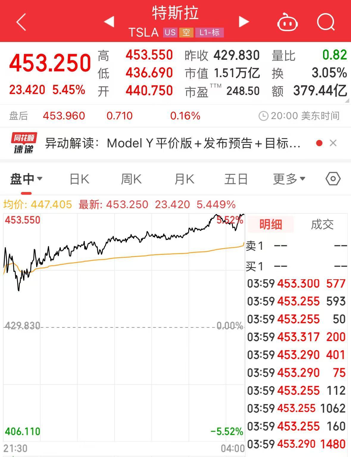盘面上,截至美股最新收盘,特斯拉涨超 5%。