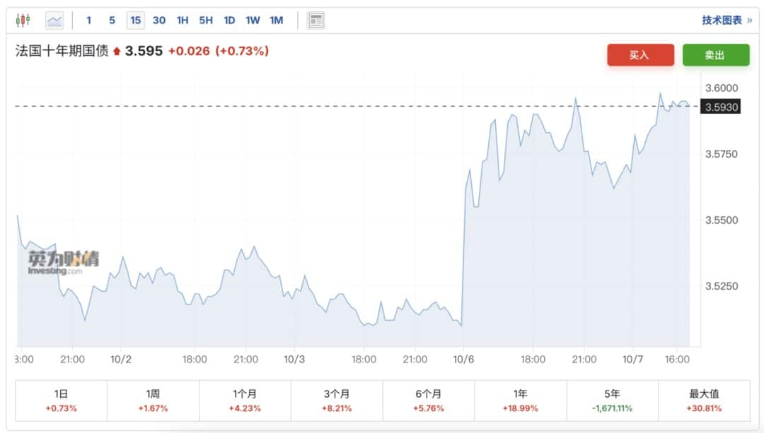 10 月 7 日,法国国债市场再度遭遇猛烈抛售,法国十年期国债收益率一度升破 3.6%,逼近 2011 年欧债危机期间的高位。