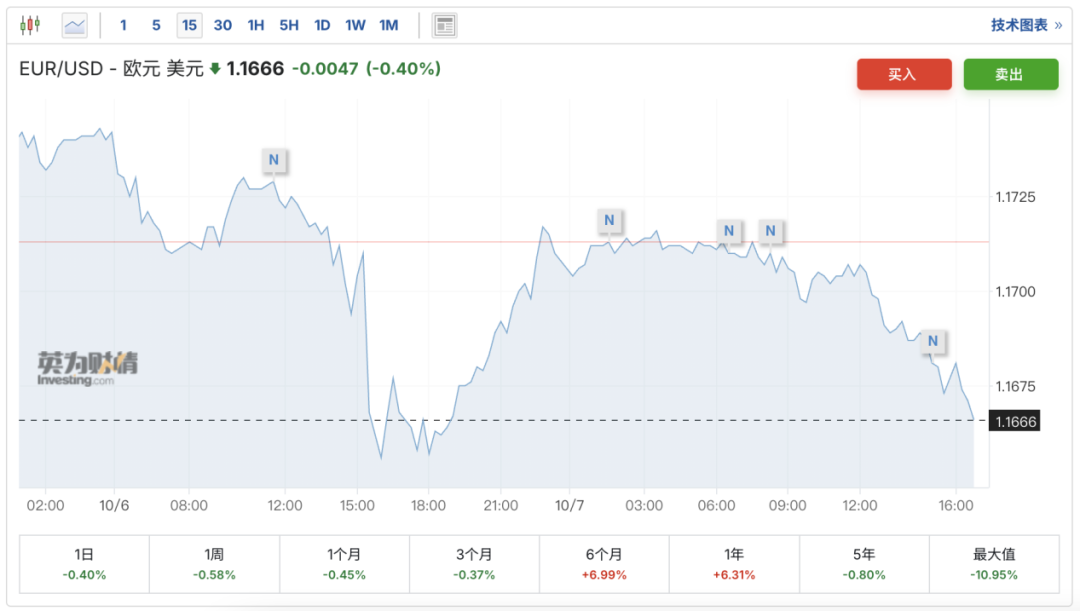 受此影响,投资者对法国财政稳定性的担忧急剧升温。法国国债市场遭遇猛烈抛售,10 月 7 日,法国十年期国债收益率一度升破 3.6%,逼近 2011 年欧债危机期间的高位。另外,欧元兑美元汇率持续下挫,现已跌破 1.170 整数关口。