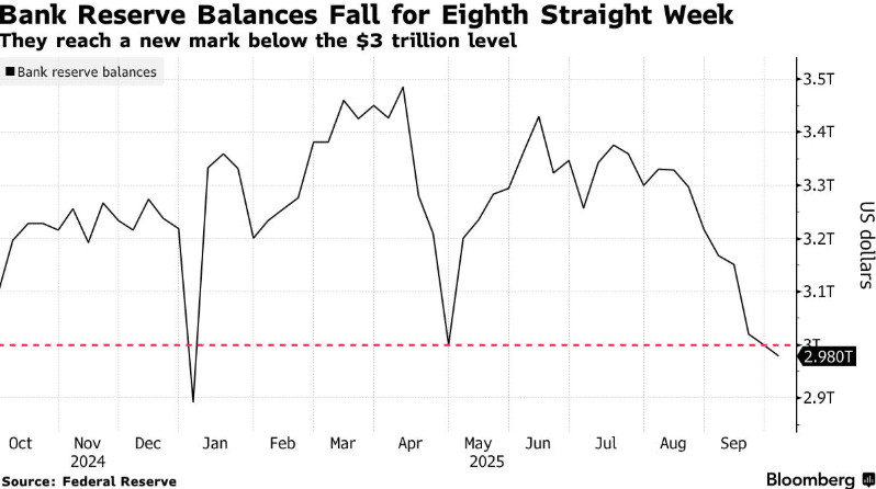 其结果是,有担保隔夜融资利率与美联储基准利率——即有效联邦基金利率——之间的利差已接近 2024 年底以来的最阔水平。与此同时,最新数据显示银行准备金已跌破 3 万亿美元关口,创下今年 1 月以来新低。