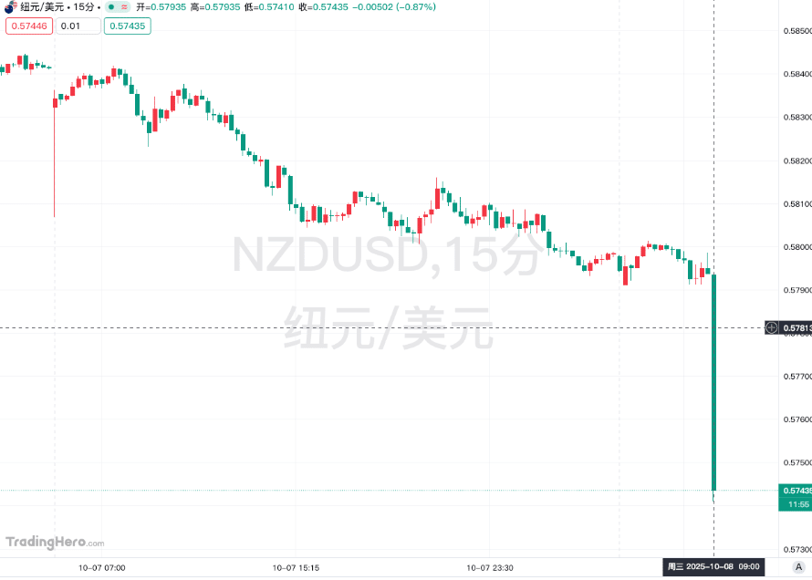 新西兰联储超预期降息 50 个基点后,纽元兑美元短线跌幅一度扩大至 40 点,报 0.5749,日内跌超 1%。