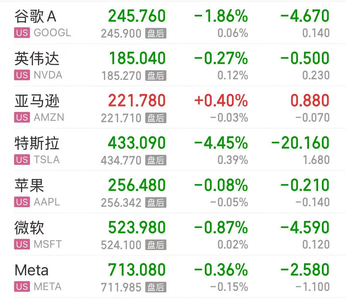 大型科技股多数下跌,特斯拉下跌 4.46%,市值蒸发 650 亿美元 (约合人民币 4630 亿元),谷歌下跌 1.86%,英伟达、苹果、微软、Meta 微跌,亚马逊上涨。