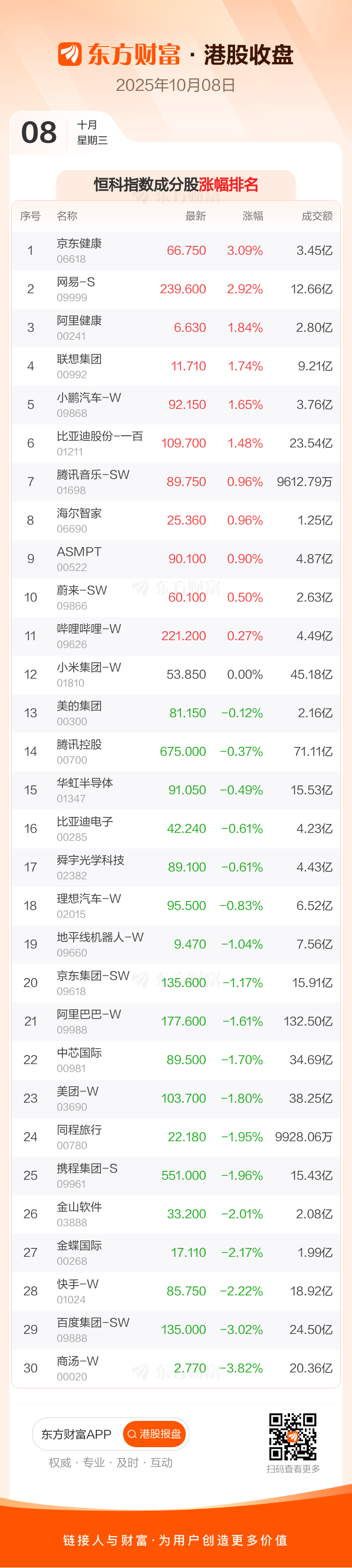 港股 10 月 8 日收盘走低,恒生指数收报 26829.46 点,跌 128.31 点,跌幅 0.48%;恒生科技指数收报 6514.19 点,跌 36.11 点,跌幅 0.55%。恒生指数成分股中恒安国际、吉利汽车、京东健康涨幅居前,龙湖集团、百度集团-SW、中国海外发展跌幅靠前。恒生科技指数成分股中京东健康、网易-S、阿里健康涨幅居前,商汤-W、百度集团-SW、快手-W 跌幅靠前。