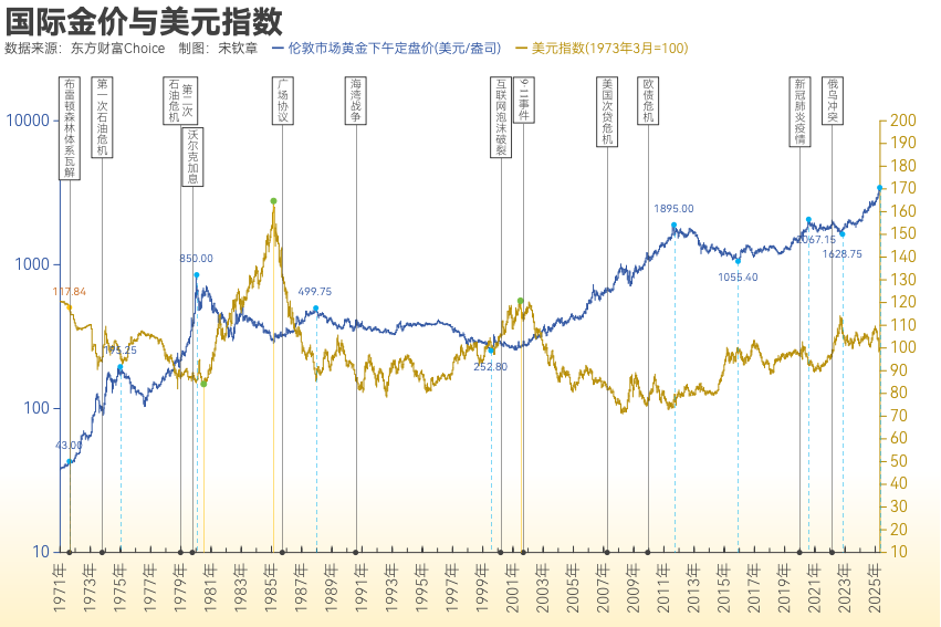 上述华尔街投行贵金属部人士向记者分析说,1970 年至 2000 年,美元指数涨跌与黄金价格波动之间保持着明显的负相关性。