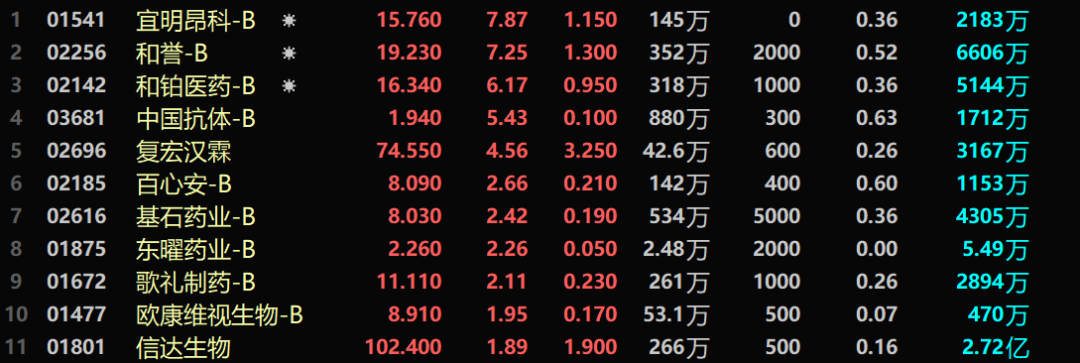 长风药业开盘表现强劲,生物科技板块今天早上亦一度逆市上涨近 1%。宜明昂科、和誉、中国抗体、复宏汉霖、和铂医药等多只个股大涨。