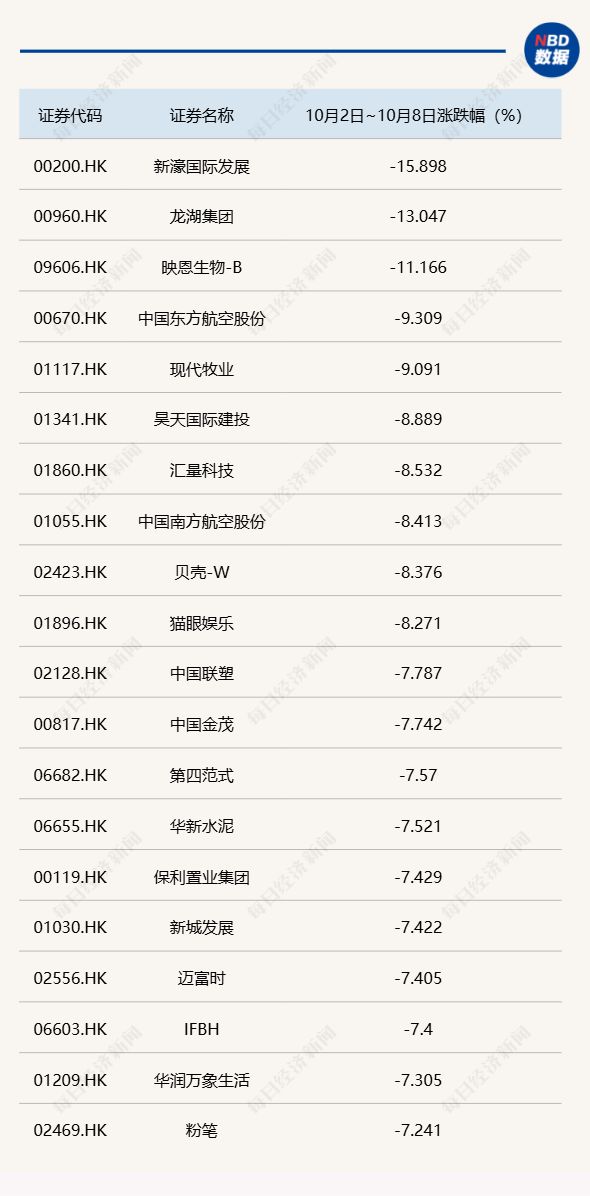 港股通标的 10 月 2 日~10 月 8 日累计跌幅 TOP20