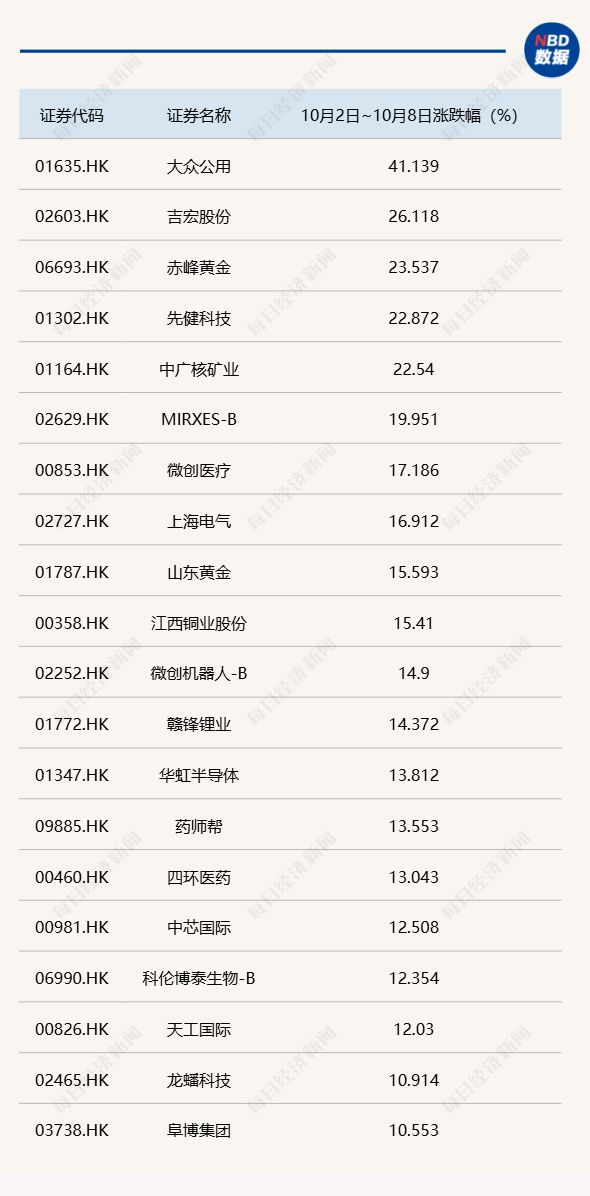 具体到个股层面,据 Choice 数据,10 月 2 日~10 月 8 日,港股通标的中涨幅前 10 的个股分别为大众公用、吉宏股份、赤峰黄金、先健科技、中广核矿业、MIRXES-B、微创医疗、上海电气、山东黄金、江西铜业股份,科技、有色板块仍然占据行情主导。