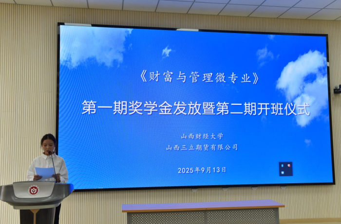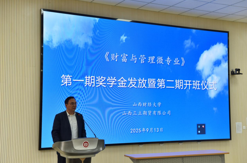 2025 年 9 月 13 日上午,山西三立期货有限公司 (以下简称 「三立期货」) 与山西财经大学联合举办的微专业第一期奖学金发放暨第二期开班仪式典礼在山西财经大学举行。本次典礼由山西财经大学金融学院院长李静萍教授主持,三立期货副总经理史海兵、首席风险官魏春苓等相关人员及金融学院师生代表及微专业项目全体学员共同参与,标志着校企合作迈向更深层次、更广领域的新阶段。