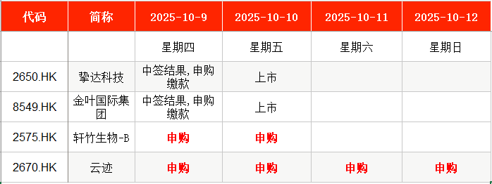 Wind 数据显示,本周 (10 月 9 日-10 月 12 日) 港股的轩竹生物-B(02575.HK) 将在周四至本周五申购。云迹(02670.HK) 则将于周四至周日申购。