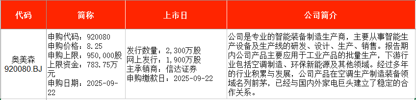 周五 (10 月 10 日) 北交所将有 1 股上市,为格力电器、美的集团的供应商——奥美森智能装备股份有限公司 (下称 「奥美森」,920080)。