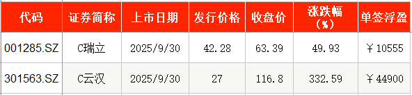 「十一」 假期前的最后一个交易日,广州瑞立科密汽车电子股份有限公司 (下称 「瑞立科密」,001285)、云汉芯城 (上海) 互联网科技股份有限公司 (下称 「云汉芯城」,301563) 均登陆深交所。其中,瑞立科密上市首日的单签浮盈为 1.06 万元,云汉芯城上市首日的单签浮盈高达 4.49 万元。