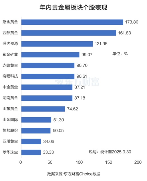 得益于国际金价的拉升,年内 A 股贵金属板块集体强势。东方财富Choice 数据显示,截至 9 月 30 日收盘,招金黄金、西部黄金、盛达资源年内纷纷翻倍,涨幅分别为 173.8%、161.83%、121.95%。紫金矿业、赤峰黄金、晓程科技年内则累涨超 90%。整体而言,13 只贵金属概念股,年内悉数上涨,上涨中位数高达 87.21%。