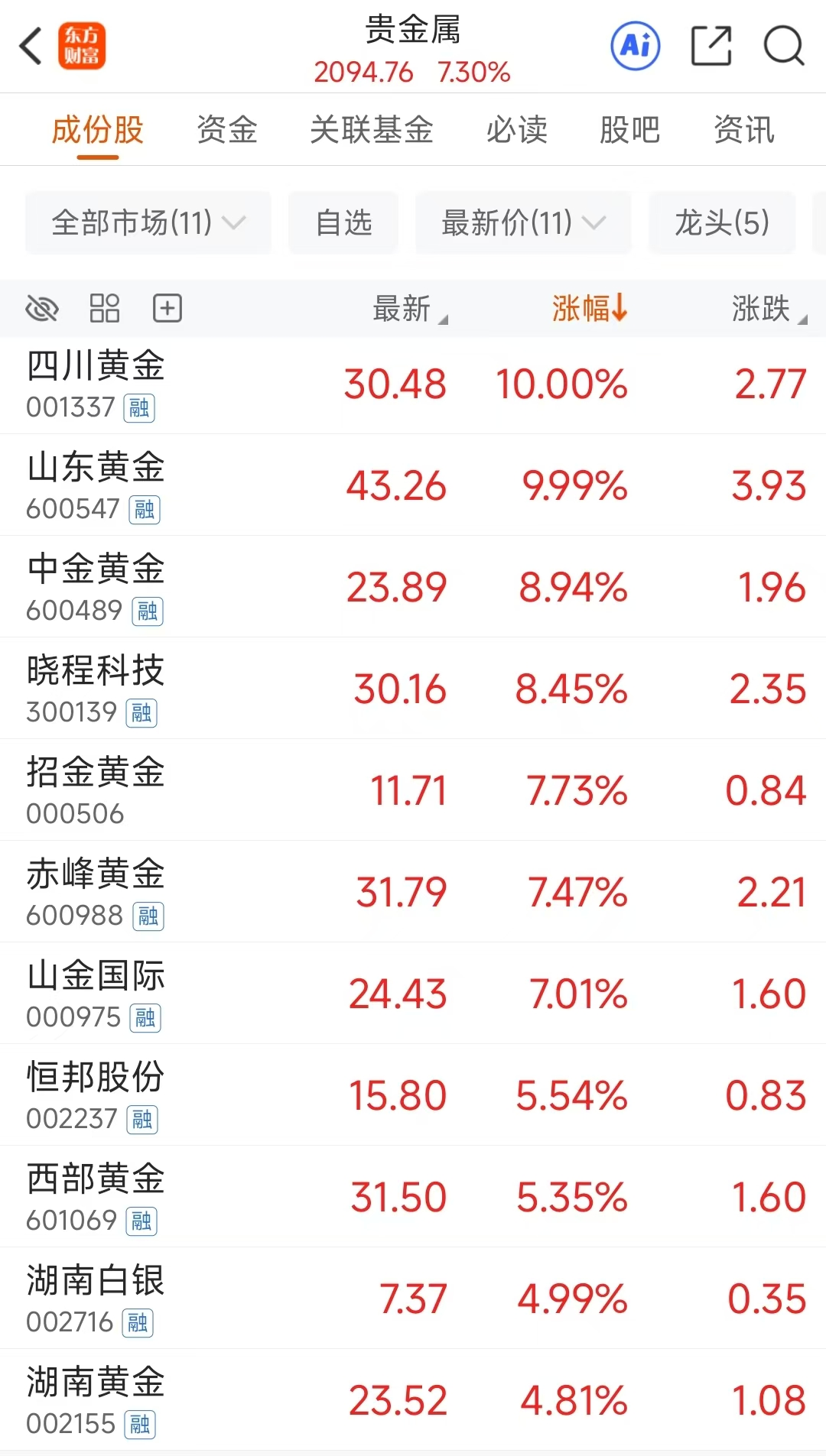 受国庆假期期间金价飙涨带动,10 月 9 日早盘 A 股贵金属板块强势领涨,早盘收盘时指数大涨 7.3%,板块中四川黄金、山东黄金涨停。
