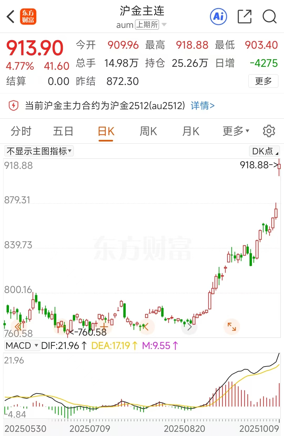 沪金期货主力合约在 10 月 9 日也是跳空大涨,突破 900 元/克关口,创历史新高,早盘收盘时报 913.9 元/克。相关 ETF 基金同样纷纷走强,黄金 ETF、黄金股票 ETF、有色 ETF、有色金属ETF、工业有色 ETF 等纷纷大涨,其中黄金股票 ETF 早盘收盘时大涨 7.95%。