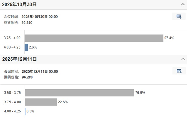 而美联储利率观测工具最新数据显示,10 月美联储降息 25 个基点的概率高达 97.4%,12 月继续降息 25 个基点的概率为 76.9%。目前,美国的联邦基金利率目标区间为 4%~4.25%。