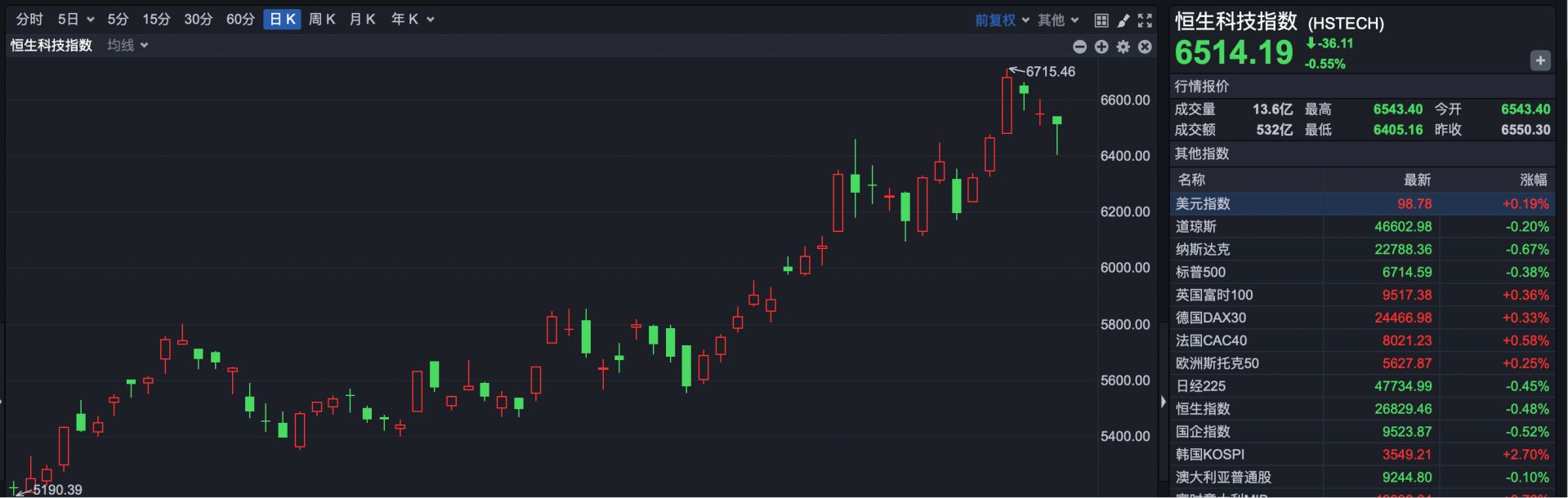 恒生科技指数报收于 6514.19 点,下跌 36.11 点,跌幅 0.55%。