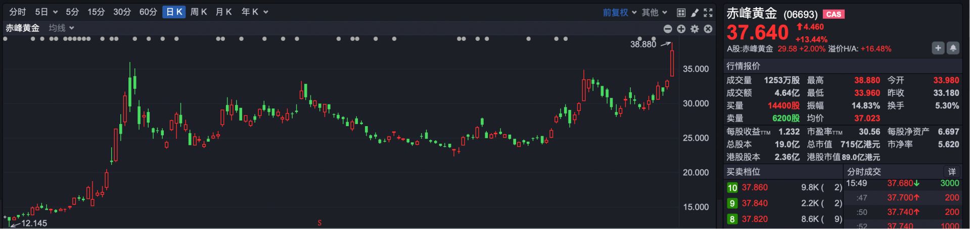 焦点板块,黄金股继续成为全天热点。板块中,赤峰黄金 (06693.HK) 涨超 13%,创历史新高;中国白银集团 (00815.HK) 涨超 12%,山东黄金 (01787.HK) 涨超 7%,招金矿业 (01818.HK) 涨超 4%,灵宝黄金 (03330.HK)、潼关黄金 (00340.HK) 跟涨。此外,紫金矿业 (02899.HK) 小涨 0.29%,紫金黄金国际 (02259.HK) 逆势回落 0.48%。