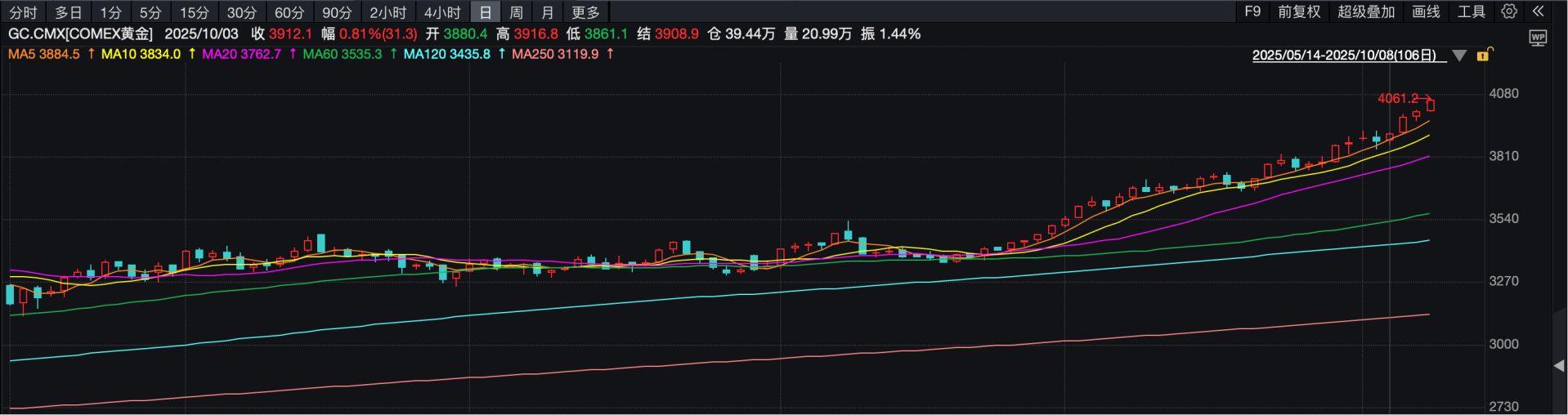 消息面,COMEX 黄金价格涨超 1.3%,最高报 4061.2 美元/盎司,再创历史新高。高盛在近期发布的报告中提到,近期金价上涨主要反映了三大 「坚定买方」 加大购买黄金:快速增长的西方 ETF 仓位、各国央行可能重新加速购买,以及投机仓位的提升。尤其是西方黄金 ETF 的配置在 9 月份意外强劲。基于各国央行预计将持续增持黄金,以及个人投资者对黄金的大力买入,10 月 7 日高盛将 2026 年 12 月黄金价格预期从每盎司 4300 美元上调至每盎司 4900 美元。